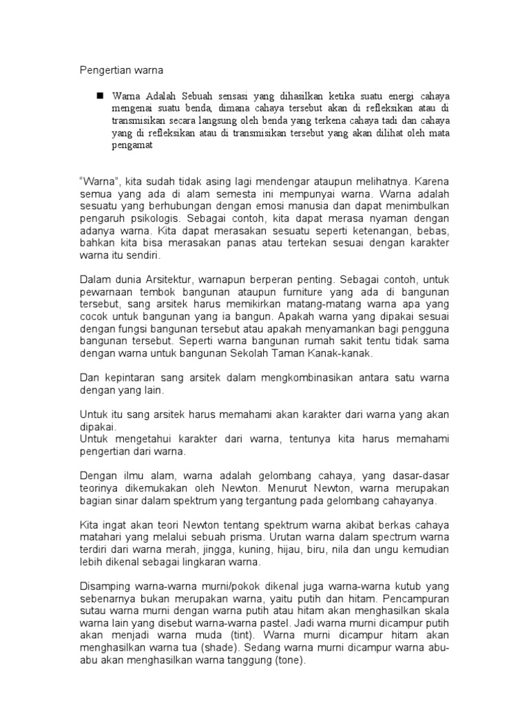 Warna harmoni dapat menimbulkan kesan perasaan selesa dan tenang. Warna merah adalah warna yang beraura kuat, memberi arti gairah dan memberi energi untuk menyerukan terlaksananya suatu tindakan. Warna adalah sebuah kesan, pigmen, atau spektrum tertentu yang tertangkap oleh mata dari cahaya terhadap benda yang dikenai cahaya tersebut. Berikut merupakan gambar dari lingkaran warna: Ini adalah warna lain yang menarik perhatian anda dan oleh karena itu juga dapat digunakan untuk menunjukkan kewaspadaan, seperti merah dan oranye. Merah yang merupakan warna darah adalah simbol kehidupan, dan itu adalah warna yang dipakai oleh pengantin wanita di cina. Perpaduan warna komplementer akan tampak indah karena keduanya berbeda jauh, saling melengkapi. Teori warna atau color theory adalah pedoman yang digunakan desainer dalam memilih warna. Harmoni warna adalah teori susunan warna yang dapat kita pakai dalam sebuah desain sesuai dengan jenis struktur warna. Warna merupakan salah satu unsur yang tidak bisa berdiri sendiri. Color wheel merupakan dasar dari teori warna, yaitu sebuah bagan yang memetakan segala warna yang ada. Sewarna dapat dihasilkan dengan campuran satu warna dengan hitam bagi mendapatkan kesan. Warna tersier adalah campuran salah satu warna primer dan sekunder, contohnya warna coklat.